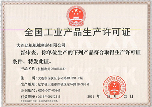大连辽机机械密封公司取得全国工业产品生产许可证证书