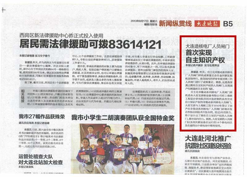 《大连晚报》在2013年8月17日 B5版,以“大连造核电厂人员闸门 首次实现自主知识产权”为标题对大连宝原核设备有限公司“自主化非能动系列核电厂人员闸门样机”成果鉴定会进行了报道。原文转载如下: