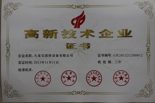 近日,宝原公司获得了大连市高新技术企业证书。宝原公司于2012年正式启动申报高新技术企业,历时16个月,在市、区科技局的帮助指导下,经集团公司领导与公司领导、技术、财务等相关部门的共同努力,于2013年10月份顺利通过评审,并于近日获取了高新技术企业资质证书。获得该证书不仅为公司研发新产品、新技术及拓展市场夯实了基础,还进一步提升了公司在装备制造行业的技术能力。