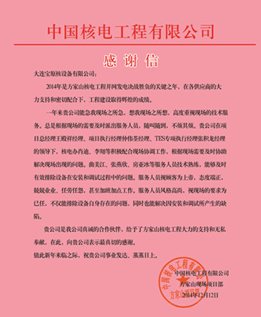 12月12日,大连宝原核设备有限公司收到来自方家山现场项目部的感谢信.