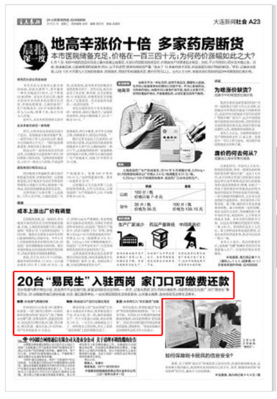 《半岛晨报》在2015年6月16日A23版,以“20台‘易民生’入驻西岗,家门口可缴费还款”为标题对大连迅通网络技术有限公司“易民生”智能终端进行了报道。原文转载如下: